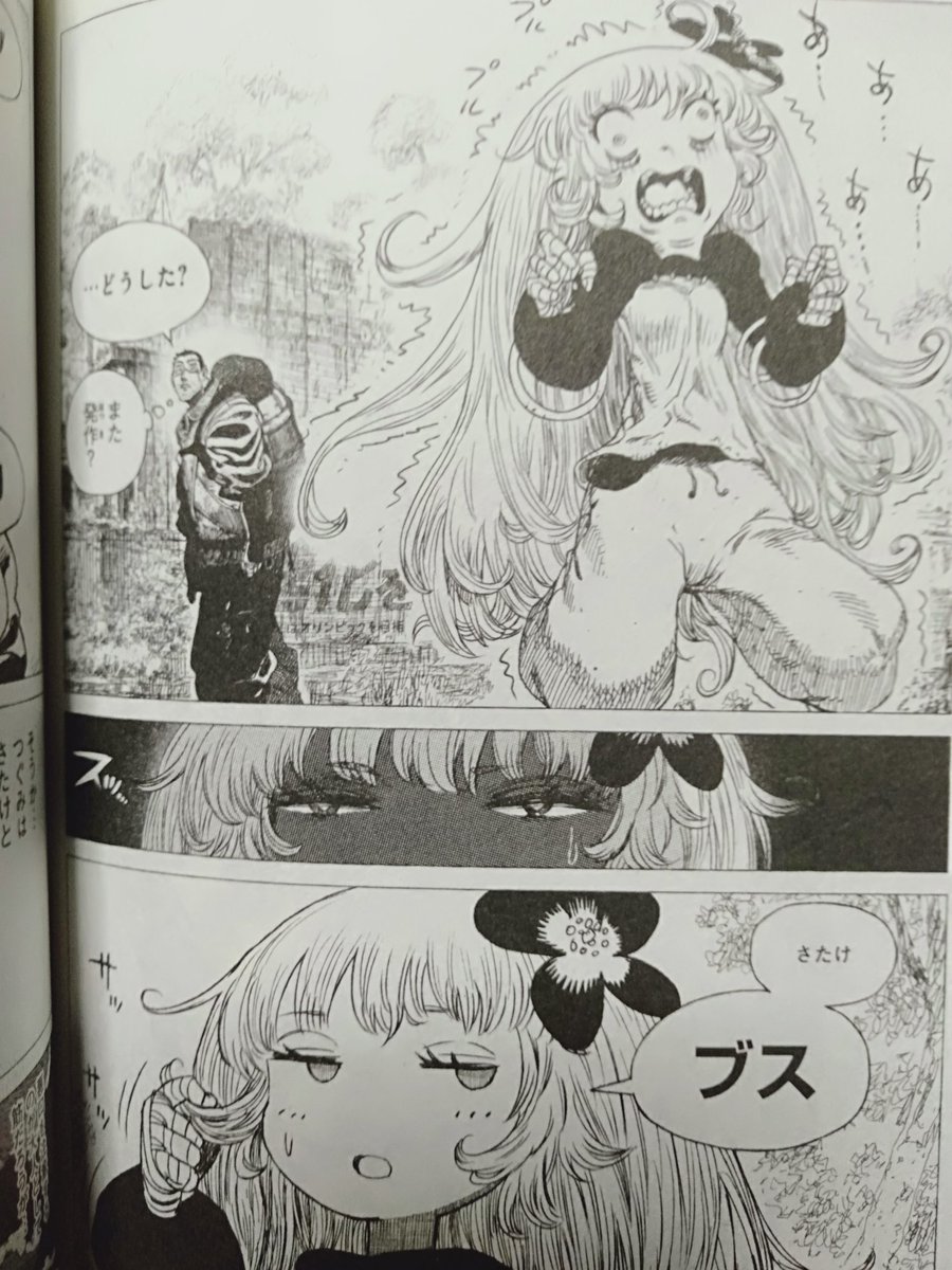 荒廃、異形。それだけで既に好きな要素なのだが読めばもっと好きになる。匂いを嗅ぎたくなるのは面白い漫画の証拠だと3巻の帯の人も言ってた気がする。言ってないかもしれない。個人的にはつぐみちゃんの髪に顔を突っ込んで思い切り匂いを嗅いでみたい。人類は滅亡する。#虎鶫 pic.twitter.com/XBYF6bRa9U